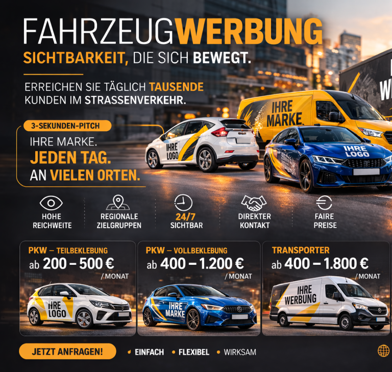 Erlebe eine neue Form der Autowerbung und werde Werbefahrer in Bremen, Hamburg, München oder Bundesweit indem Du dein Auto als Werbefläche zur Verfügung stellst. Dank attraktiver Mieteinnahmen hälst Du deine monatlichen Fahrzeugkosten gering und den Fahrspaß groß!